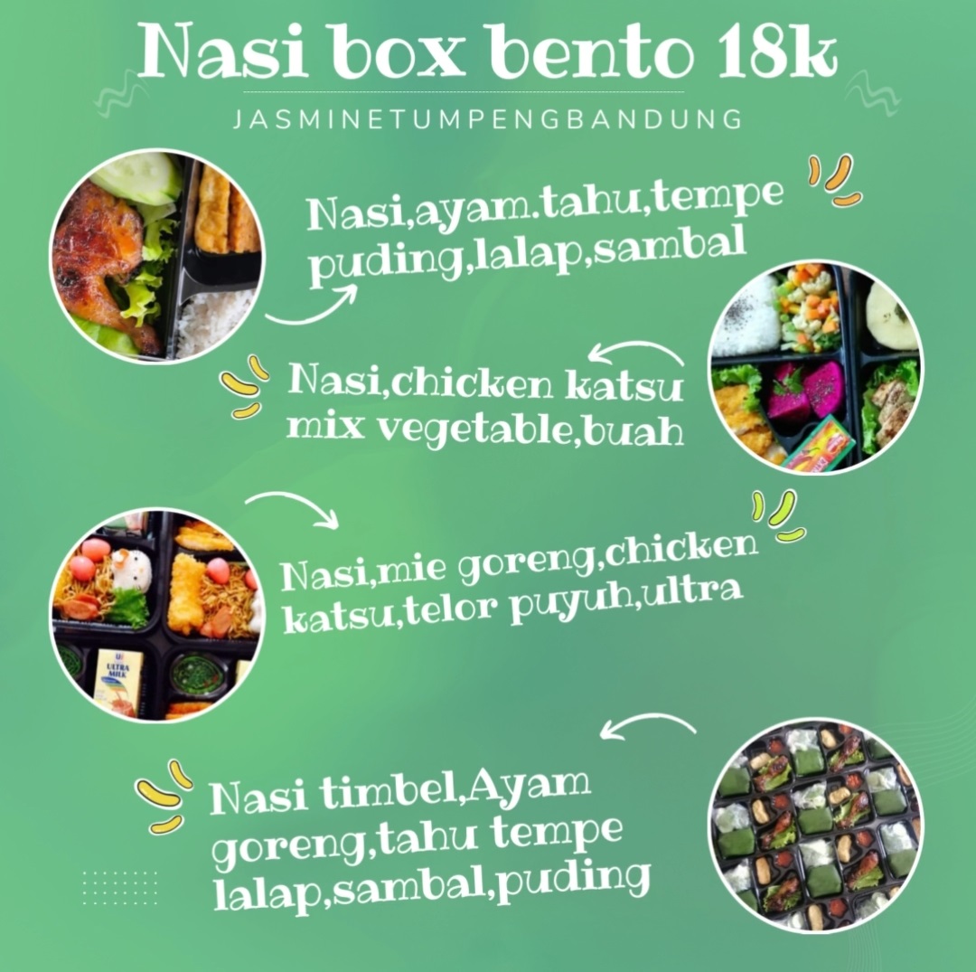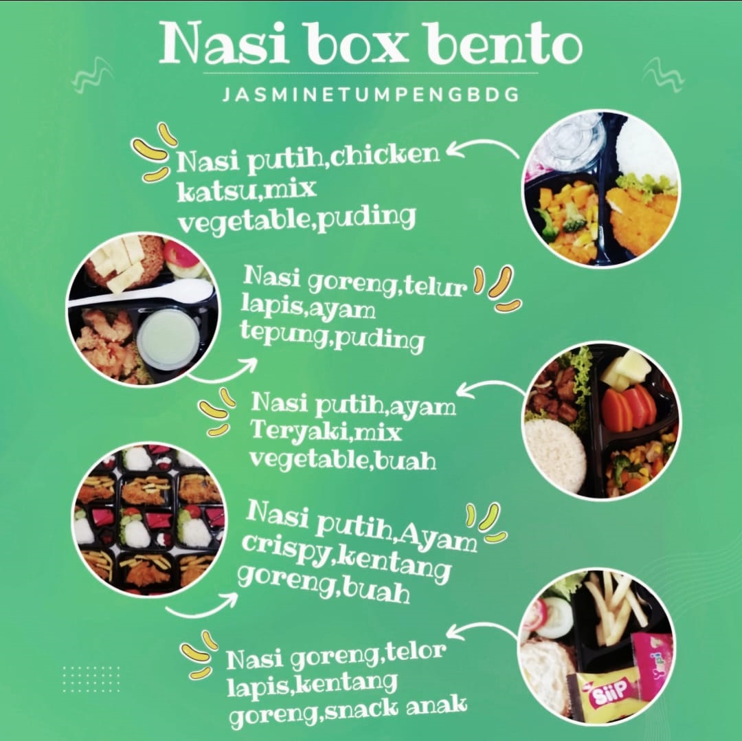 Jasmine tumpeng bandung menyediakan berbagai pilihan menu nasi box dalam kemasan box bento, dengan harga yang terjangkau dan rasa yang nikmat. Nasi box bento untuk sekarang ini dijadikan pilihan terbaru setelah banyak permintaan dari pelanggan setia mengenai variasi menu dan kemasan.